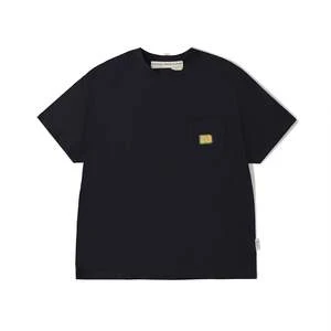 Custom knit t-shirt with custom gold authenticity holographic patch, woven flag label, and signature pulltab on back neck.