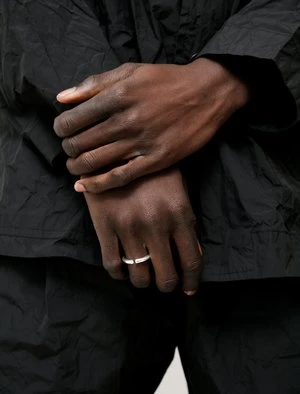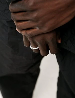 An open ring with the All Blues logo in the cross-section. The ring is made from recycled .925 sterling silver and has a polished finish. Comes in a branded jewelry pouch and box.