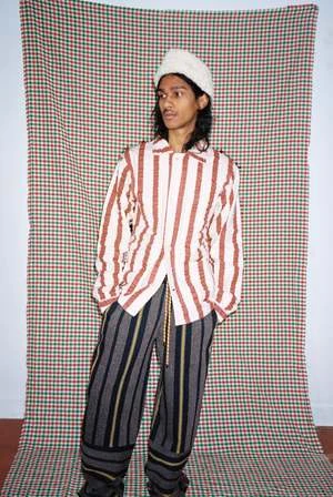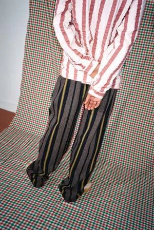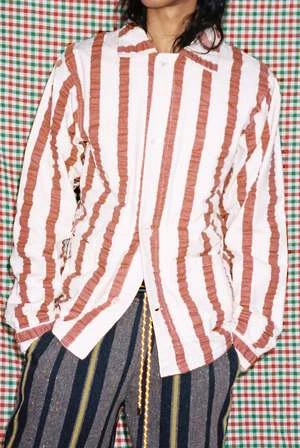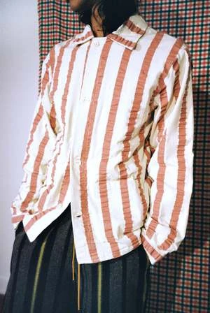 Candy striped woven linen jacket in beautiful dusty rose and ecru. This jacket is crinkled ever so slightly, like a ribbon, pulled out of a forgotten pocket. Mother of pearl front button closure, and button wrist closure.