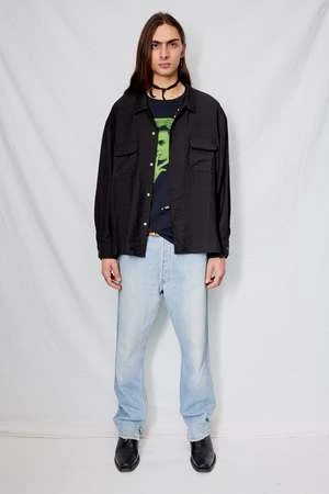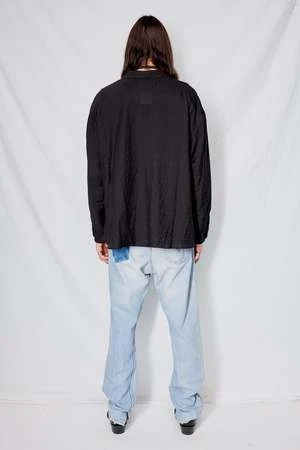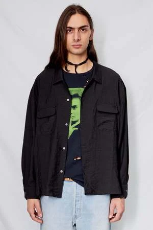 Black Stripe Rayon Crop Pocket Shirt from Assembly New York. Button front closure. Double chest pockets. Relaxed, boxy fit.