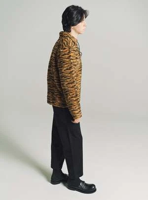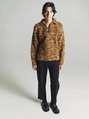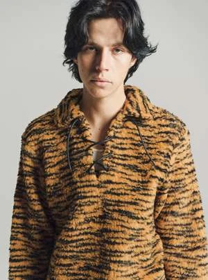 This pullover is inspired by a sweater from the 1970s. We reproduced the silhouette, with its lace-up neckline and tiger stripes, in a soft fleece.