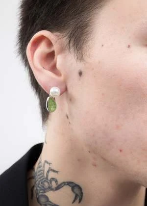 Brass teardrop shaped earring with pearl stud. White gold rhinestone attached by hoop. Stud fastening.