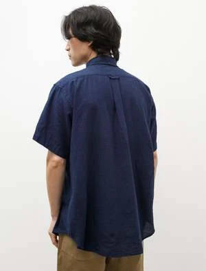 An oversized, short sleeve popover shirt cut from a loosely woven cotton voile with an open structure in pigment dyed navy. Features a three button closure with button down collar, a button closure flapped patch pocket at the left breast, a clean finished, bias cut yoke with an external hang loop, and a box pleat at the centre back. Closure placket is formed by pleating the front panel, adding volume and an airy sense of ease complemented by a gently curved hem with a dropped back hem. Durably constructed with chain stitched, flat felled seams for a long lasting finish that is highly resistant to wear; black mother of pearl buttons.