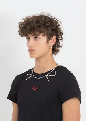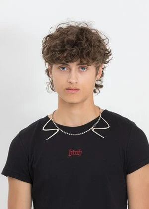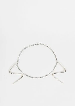 Silver-tone crystal necklace. Features a tennis-chain inspired necklace with curved “S” detailing at the collarbone. Lobster-claw fastening.