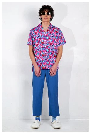 The “Desi” camp collar shirt is given a modern twist with a colorful, dreamy red floral print on a soft Cotton Tencel blended twill which captures the hazy mood of classic Dream Pop records.
