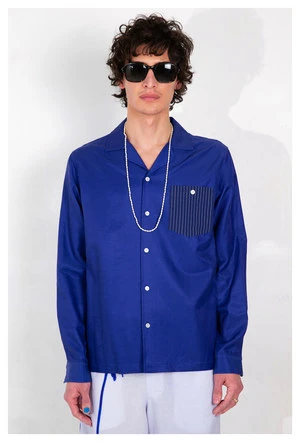 Our Arenas camp collar shirt is given a modern twist with an electric blue Japanese cotton cupro linen twill. The pocket and inside yoke are in a tonal blue & white stripe cotton voile.