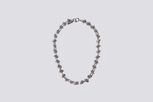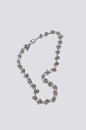 The Daria Necklace is a silver-tone knot chain necklace made of brass dipped in palladium. Featuring logo charm detailing and a spring-ring clasp, this necklace is a perfect layering piece. Justine Clenquets jewels are subtle mixes of styles and edgy reinterpretations of classic pieces. Designed and handmade in France.