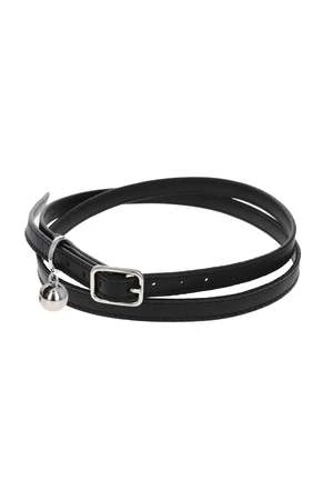 A thin black leather choker with eyelets and charms. Punk-inspired silver-tone o-ring hardware, piercings, pearl, and logo charm detailing. Adjustable pin-buckle strap.