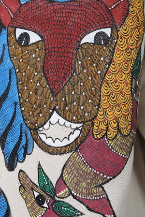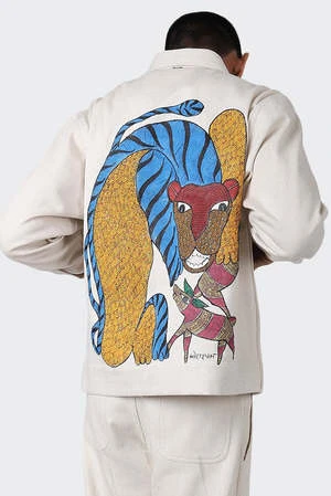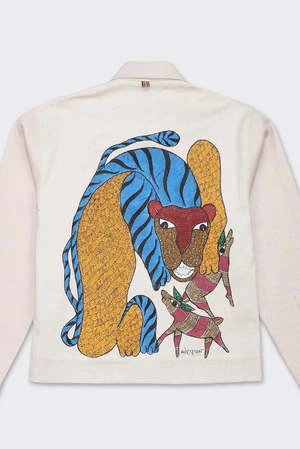 A form of painting by one of the largest tribal communities in India, the Gond, who mostly hail from Madhya Pradesh, the technique involves painting in a line and dot form. These pieces have been painted by Mahesh Shyam, a 28 year old Gond artist from Bhopal. His paintings depict tales from the forest and nomadic life of the tribe inspired by the stories he heard from his grandparents who lived in the forest. They saw the forest life closely and had several fables in which animals were personified. Though I havent seen the forest life that closely, their tales helped me imagine what it would be like living in the forest, Kardo’s handloom 31 denim uses a khadi (handspun) yarn either left in its natural undyed state or dyed with natural indigo. It is then woven on a handloom in Gondal, Gujarat, by the weaving collective Udyog Bharti that supports over 2000 weaving families in sustainable textile production.