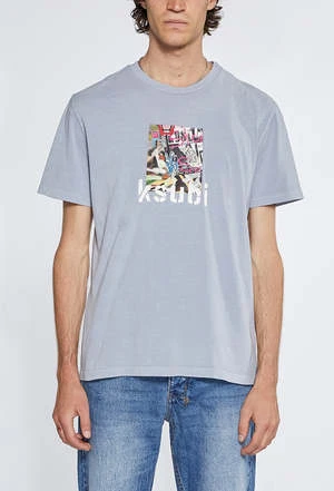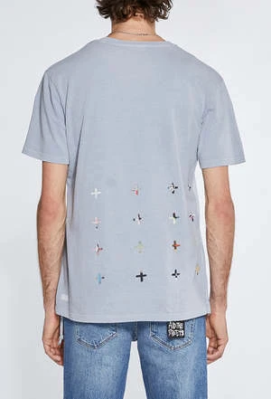Regular fitted t-shirt with short sleeves and crew neck reverse overlocked side seam detail and signature rats tail Made from a premium cotton jersey in an overdyed light blue with an aged wash. Features screen prited artwork. Finished with signature t-box and XL 4×4 screen prints.