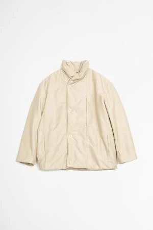 This puffer jacket is made of a water-repellent cotton-nylon blend that is both sturdy and warm. It has a loose fit with a wadded body that is slightly cropped, accentuated by an offset front opening and a high convertible stand collar.