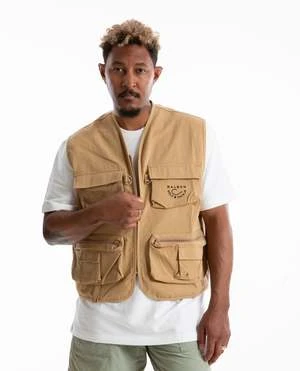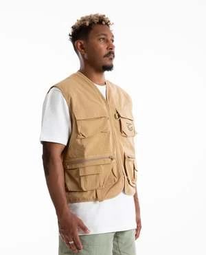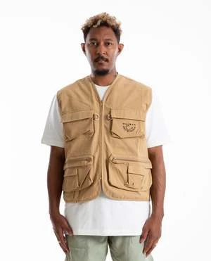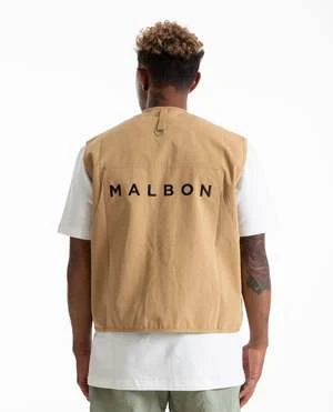 Golf & Tackle Utility Vest in tan by Malbon Golf. Features zippered front closure and pockets enhance the functionality of this Vest from Malbon Golf & Tackle, additionally featuring an embroidered logo on the left pocket and a metal D-ring at the top of the back. A pocket opening is also present on the back.