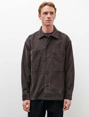 A generous button front overshirt cut from a super dense, yet soft, needle cord in a rich muted brown. Features a classic collar, large dropped patch pockets at the breast, a clean finished back yoke, split side seams, and a flat hem. Cut with a generous two-piece sleeve that offers a slight forward stance lending a sense of elegance to an otherwise utilitarian silhouette. Durably constructed with chain stitched flat felled seams throughout for a hard wearing finish that will last many years to come.