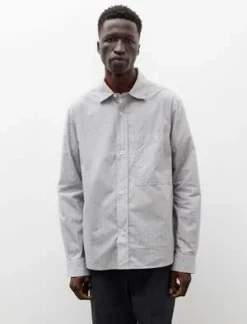 A loose fitting, overall workshirt cut from a durable, crisp, yarn dyed cotton shirting in a mixed grey stripe. Features a classic shirt collar, a wide strap style button placket, a large button closure breast pocket, and a two-piece clean finished back yoke with pleats at the shoulder. The sleeve is designed with Margaret Howell’s signature two-piece patterning to control bulk at the back shoulder; a triangular gusset at the front hem removes stress from the side seam and prevents easy tearing. Durably constructed with flat felled seams throughout for a hard wearing finish that will last many years to come.
