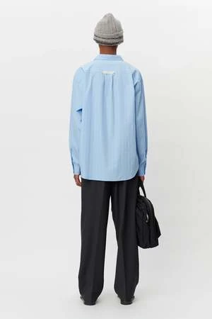 Oversized shirt made in a white poplin fabric with woven stripes. The Tendency Shirt is oversized and very relaxed with drop shoulders and a rounded hem. Made with front placket, spread collar and back yoke featuring a lace tape hanger loop over the center back pleats.
