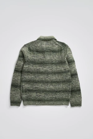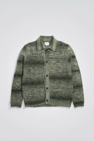 A jacket style knitted from a blend of cotton, mohair, alpaca and polyamide which varies in colour gradation. It features a set-in sleeve, a button through placket with full needle collar and a 3×3 rib hem and cuffs.