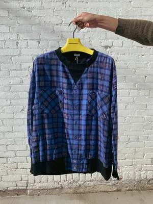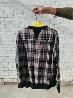 Taking a classic cotton flannel shirt and converting it into a pullover crewneck sweatshirt, front buttons functioning with two snap buttons at hem. Each piece is unique.