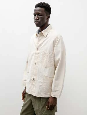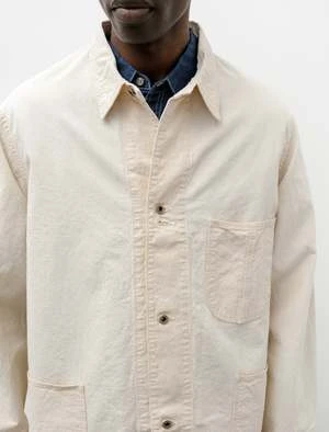 A loose fitting coverall shirt jacket cut form a lightweight, undyed, washed cotton twill with a slubby surface texture. Features a classic shirt collar, two-piece back construction, a left breast pocket with a pen holster, wraparound waist pockets, and engineer style cuffs. The shifted side seam sits closer to the back offering a more generous front and removing a potential catch point at the side; the design of the cuffs rolls back easily and allows them to sit securely once flipped. Constructed with Orslow’s trademark attention to durability using chain stitched flat felled seams throughout for a hard wearing, long lasting finish; silver tone tack buttons throughout.