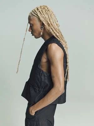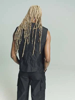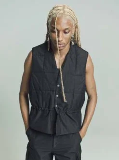 Our Air Vest in Black High Twist Solaro. Produced in an iridescent Italian cotton and polyamide blend fabric the mens Air Vest has a boxy fit and features a square quilted body, snap stud closure, a drawstring waist and a patch inside pocket.