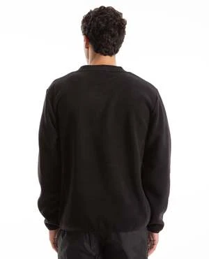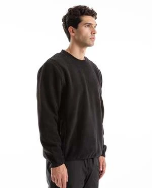 Fleece Crew Neck in black by Rains. Features a soft double-sided micro fleece that is designed for comfort and breathability. It has elasticated binding details and a clean aesthetic for a modern look.