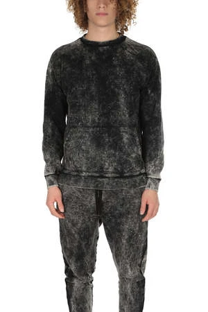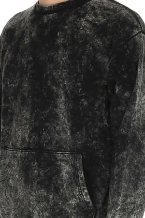 Crewneck sweatshirt in acid wash black. Rib knit collar, cuffs, and hem, and kangaroo pocket at waist.