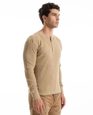 Waffle Knit Henley in tan heather by RRL. This Waffle Knit Henley is crafted from soft waffle-knit fabric in a timeless, neutral tan shade. The vintage-inspired button-front placket lends a lived-in, loved look while adding comfort and style to any ensemble.