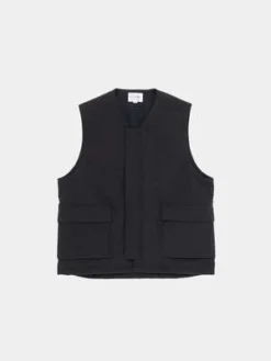 The Still By Hand Large Pocket Padded Vest in Ink Black is the newest version of the brand’s well-loved insulated vests, constructed from a water-repellant polyester exterior with Thinsulate soft touch fill for lightweight, packable warmth. The Padded Vest features a boxy cut with no side seams, snap front, and two large cargo flap pockets. Its clean, minimal design and roomy fit make it the perfect layering piece for cooler weather.