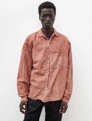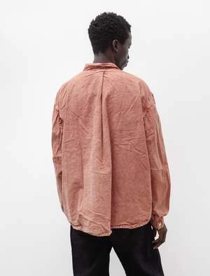A generous fitting overshirt cut from a lightweight cotton calico that has been dyed to a soft, earthy shade of orange using Sienna clay. Features Tenders classic wrinkled collar, a left breast pocket set directly against the front placket, and a yokeless back with a generous knife pleat at the neckline.. The generous body combines with a slightly dropped shoulder to create a voluminous silhouette that accents the softness of the calico nicely. Constructed with Tenders trademark emphasis on durability using chain stitched flat felled seams throughout with the signature wrinkled finish for a hard wearing final product that will last many years to come; hand cast pewter buttons, dropped rear hem..