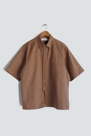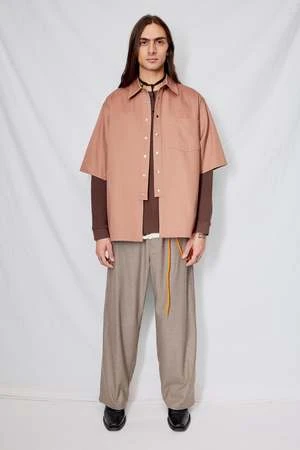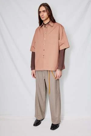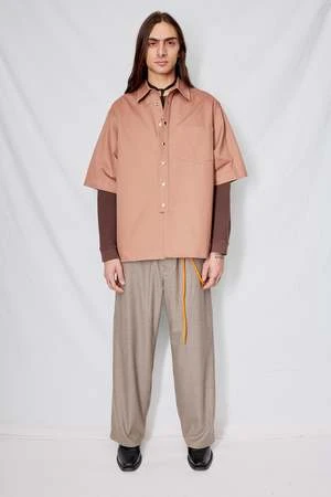 Salmon Rohlin Shirt from Third Way. Cotton twill short sleeve work shirt. Metal snap closures. Two chest pockets. Fit is loose and the sleeves sit right above the elbow. Front button placket shortened for added movement.