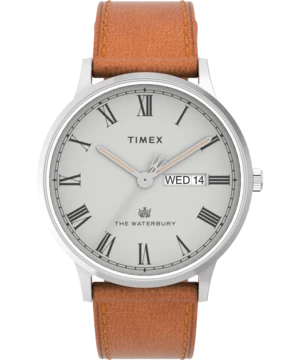 This watch pays homage to our original watch collection by using the Waterbury Watch Company logo on the dial and second hand, which bears the stylized W. Each displays our attention to craftsmanship and detail, with finely-finished surfaces and careful applications of watchmaking ingenuity. Featuring a 40mm stainless-steel case, a dove gray dial with Roman numeral markers, a day/date window, and a caramel brown leather strap, our Waterbury Classic Day/Date unites all of these elements into something thats right for your wrist today, and right for all the days to come.