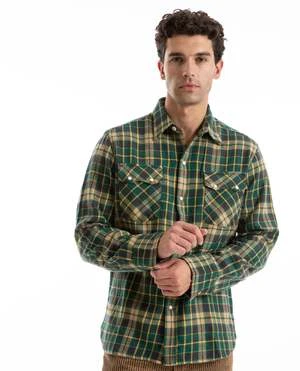 Flannel Pearlsnap Shirt in pine by Wythe. Designed to combine classic Western style with modern convenience. This shirt features a pearl snap closure, spread collar, western yoking, western pocketing, and a curved hem with a gusset for flexibility.
