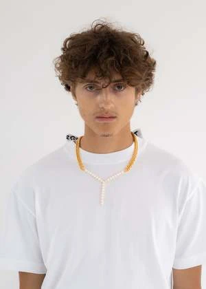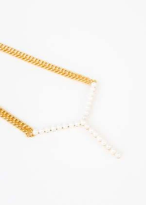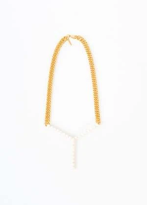 Gold-tone oversized Y pendant necklace with pearl detailing. Features a silver-tone Y logo pendant, gold-tone logo plate, and lobster claw fastening.