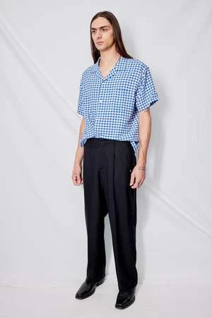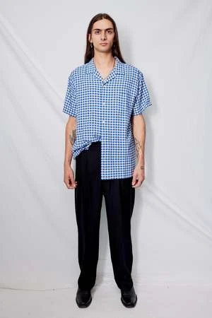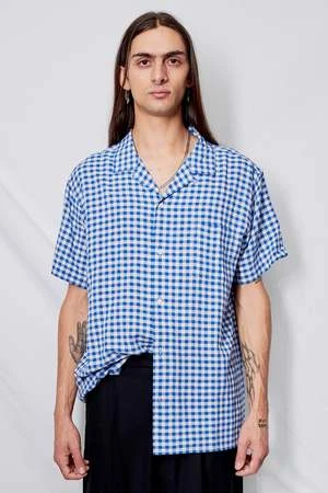 Blue / Ecru Malick Gingham Shirt from YMC. Short sleeved Cuban collar shirt in a soft Italian cotton linen gingham check. Draws on the controlled chaos of Terrence Malicks Badlands. Corozo button fastening. Chest patch pocket.